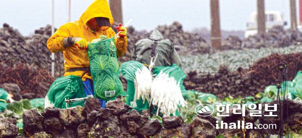 1일 제주시 한림읍 수원리 한 농경지에서 농민들이 겨울 빗속에 양배추 수확 작업을 하고 있다. 강희만기자