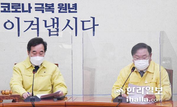 더불어민주당 이낙연 대표와 김태년 원내대표가 3일 국회에서 열린 최고위원회의에서 회의자료를 살펴보고 있다.연합뉴스