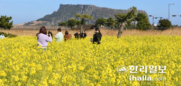 유채꽃밭서 제주의 겨울 즐기는 관광객들