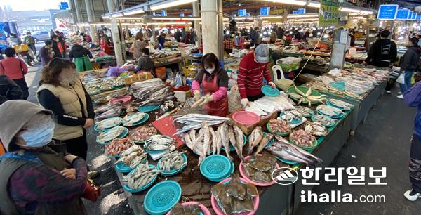 생선가게 상인 B씨는 "설 명절을 맞아 제수 용품을 사려는 손님들이 생선코너에 몰리고 있다"면서 "하지만 최근 사회적 거리두기 시행에 따라 가족모임이 어려지는 등 일손이 많이 필요한 차례상 차리기 역시 간소화되면서 옥돔 등 생선 수요가 지난해보다 절반가량 줄었다"고 말했다.