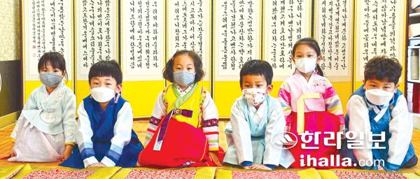 민족 고유의 명절 설이 눈 앞이다. 코로나19 시국에 맞는 설이지만 가족간의 정은 오히려 더 살가워진다. 9일 제주시 키즈빌어린이집 어린이들이 고운 색동옷을 갖춰 입고 어르신에게 올릴 세배를 연습하고 있다. 신축년(辛丑年) 새해에는 모든 가정에 건강과 행복이 가득하시기를 기원한다. 강희만기자