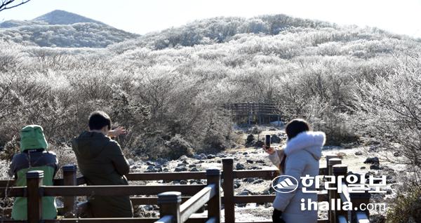 16일 1100고지를 찾은 관광객들이 하얀 상고대가 핀 주변 경관을 배경으로 사진을 찍고 있다. 강희만기자
