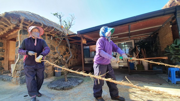 지난 16일 김만덕객주에서 성읍민속마을보존회 회원들이 초가지붕 교체를 위한 집줄놓기를 하고 있다.사진=제주문화예술재단 제공