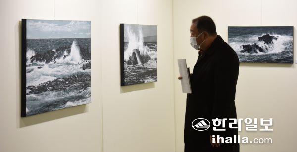 18일 한라일보 1층 갤러리 이디(ED)에서 열린 문창배 초대전 오프닝행사에 참석한 관람객이 작품을 감상하고 있다. 이상국기자