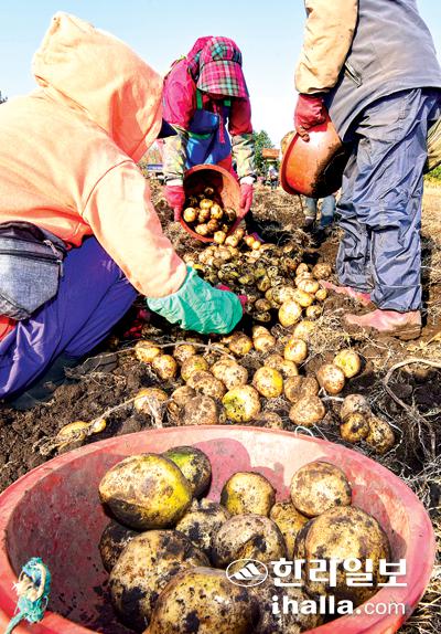 24일 제주시 구좌읍 한 밭에서 농민들이 지난해에 심은 감자를 수확하느라 분주한 모습이다. 지난해 잦은 비와 태풍으로 수확량이 많이 감소했다. 이상국기자