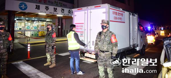 아스트라제네카(AZ) 백신 수송이 시작된 25일 보건 당국 관계자들이 철통같은 경호 속에 제주항 4부두를 통해 제주보건소에 도착한 수송차량에서 백신을 옮길 준비를 하고 있다. 이상국기자
