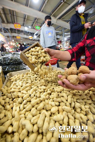 정월대보름을 하루 앞둔 25일 제주시 구좌읍 세화민속오일시장을 찾은 지역 주민들이 견과류를 구입하고 있다. 정월 대보름날 아침에 날밤·호두·잣 등 견과류를 깨 먹으면 부스럼을 예방하고 치아를 튼튼하게 해 준다고 전해져 온다. 이상국기자