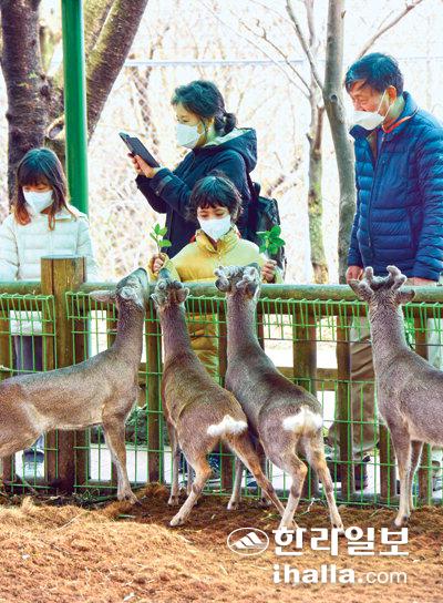 지난달 28일 제주시 노루생태관찰원을 찾은 관광객들이 노루 먹이주기 체험을 하며 즐거운 휴일을 보내고 있다. 이상국기자