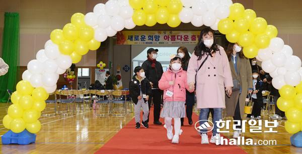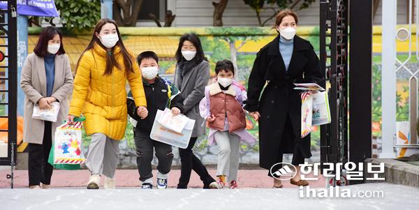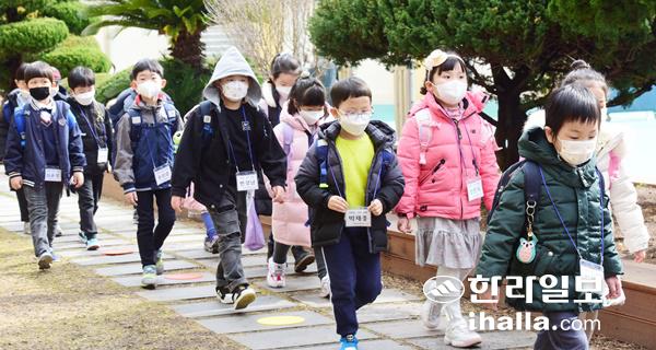 2일 제주시 광양초등학교에서 열린 입학식에 어린이들이 부모님과 함께 참석하고 있다. 이상국기자