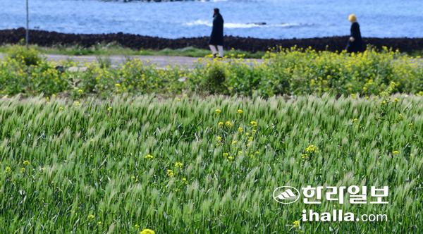시나브로 봄기운이 짙어간다. 산과 들녘에는 어느새 초록물결이 일렁인다. 포근한 날씨가 이어진 3일 서귀포시 대정읍 해안도로변 보리밭에 어느새 보리 이삭이 패어 봄소식을 전해 주고 있다. 강희만기자