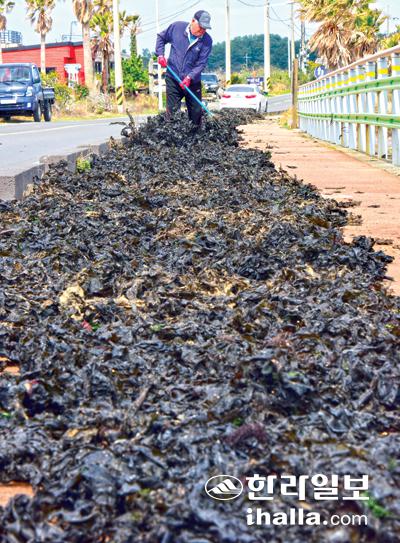 3일 제주시 구좌읍 종달리 해안도로에서 한 마을 주민이 청정 종달바다에서 수확한 감태를 말리고 있다. 이상국기자
