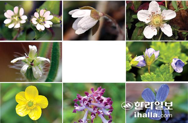 시나브로 봄 기운이 완연하다. 내리쬐는 햇살은 따스하고 스치는 바람에도 포근한 기운이 묻어난다. 경칩을 하루 앞둔 4일 야생화들이 봄 기운 가득한 비를 머금으며 활짝 피어나 저마다의 자태를 자랑한다. 사진 위 왼쪽부터 별꽃, 새끼노루귀, 장딸기꽃, 사진 가운데 양장구채, 큰개불알꽃. 사진 아래는 개구리갓, 자주괴불주머니, 제비꽃. 사진=강희만기자