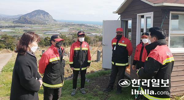 서귀포시 대정읍(읍장 송호철)은 지난 3일 모슬봉 가시악 산불감시초소를 방문해 시설점검 및 산불감시원과 산불진화대원 근무자를 격려했다. 대정읍은 봄철 산불방지를 위해 산불방지 대책본부 종합상황실을 운영하고 있다.
