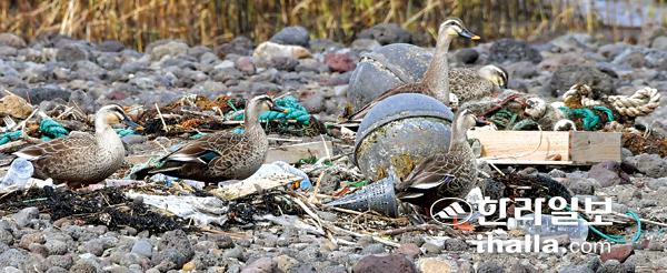 4일 제주시 애월읍 해안가에서 흰뺨검둥오리들이 쓰레기 더미에서 먹이를 찾고 있다. 강희만기자