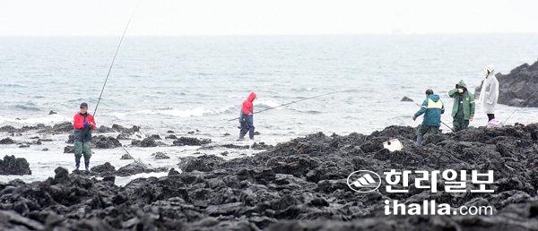 비 내리는 4일 제주시 한림읍 해안가에 낚시꾼들이 우비를 입고 낚시를 즐기고 있다. 이상국기자