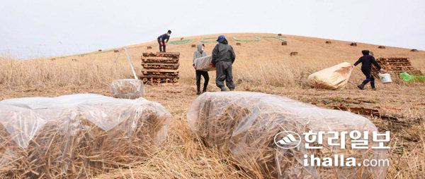 지난 6일 제주시 애월읍 새별오름에서 13일 펼쳐질 들불축제 불놓기 준비를 위해 관계자들이 구슬땀을 흘리고 있다. 이상국기자