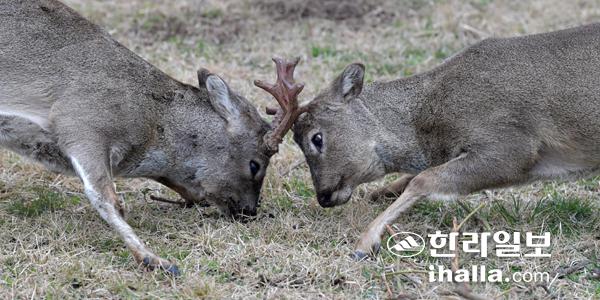8일 제주시 중산간 지역에서 숫노루들이 목숨을 건 치열한 서열 싸움을 하고 있다. 강희만기자