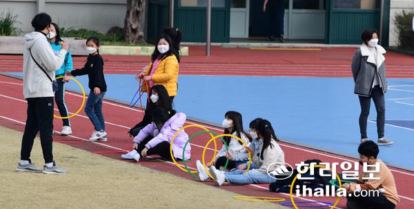 8일 제주시 한 초등학교 운동장에서 어린이들이 마스크를 쓴 채 체육활동을 하고 있다. 강희만기자