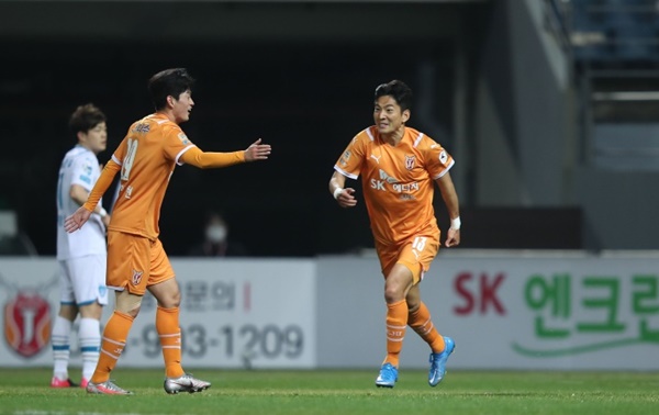결승골을 넣고 환호하는 정운(오른쪽). 제주Utd 제공