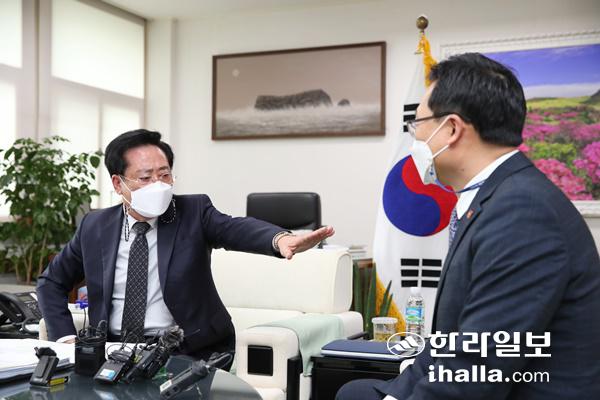 원희룡 제주지사가 10일 제주 제2공항 정상 추진을 요구한 것과 관련 제주자치도의회 좌남수 의장이 11일 고영권 정무부지사를 불러 제주도와 의회간 합의가 파기한 부분 등에 대해 따져 묻고 있다. 제주자치도의회 제공