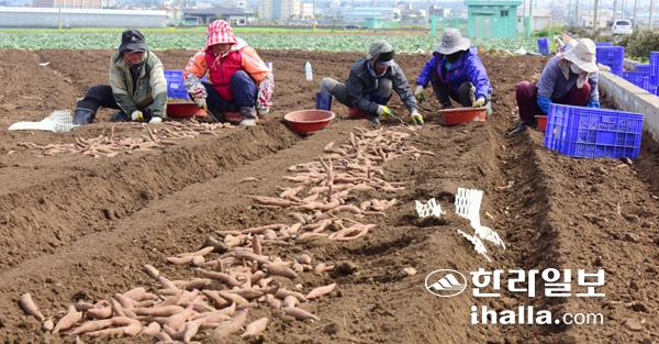 11일 제주시 한경면 한 밭에서 농민들이 고구마 파종작업을 하고 있다. 이상국기자