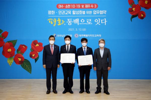 제주도교육청과 전남도교육청은 지난 12일 여수교육지원청 대회의실에서 '여순10·19 및 제주4·3 평화·인권교육 공동 추진 업무협약'을 체결했다.