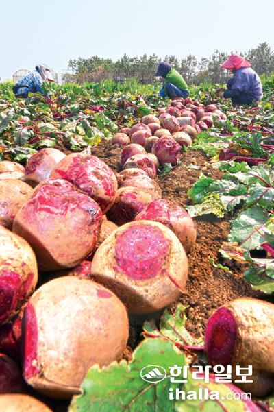 14일 제주시 한경면 한 밭에서 농민들이 비트 수확 작업으로 분주한 시간을 보내고 있다. 비트는 콜레스테롤 수치 조절에 탁월한 것으로 알려졌다. 이상국기자