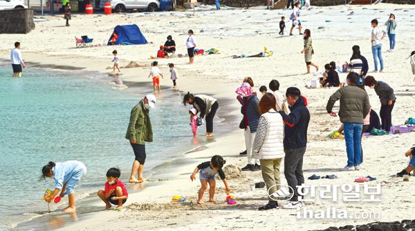 낮 최고기온 20℃를 기록한 15일 관광객들이 제주시 한림읍 협재해수욕장을 찾아 봄바다를 즐기고 있다. 강희만기자