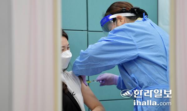16일 제주시 제주대학병원 의료진이 신종 코로나바이러스 감염증(코로나19) 화이자 백신 접종을 하고 있다. 병원 측은 19일까지 나흘간 예방 접종을 진행한다. 강희만기자