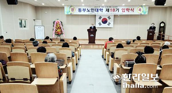 (사)대한노인회제주시지회(지회장 김태흥) 부설 동부노인대학(학장 김두홍)은 16일 제주시노인복지회관 다목적동 강당에서 제주시 관계자와 신입생 50명이 참석한 가운데 제18기 입학식을 가졌다.
