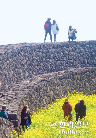 17일 제주시 구좌읍 별방진에 많은 관광객들이 찾아 기념사진을 찍으며 즐거운 시간을 보내고 있다. 이상국기자