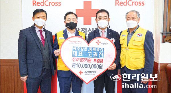 고권진 동화축산 대표는 지난 17일 제주적십자사 회장실에서 대한적십자사제주특별자치도지사(회장 오홍식)에 취약계층 지원을 위한 후원금 1000만원을 기탁했다.