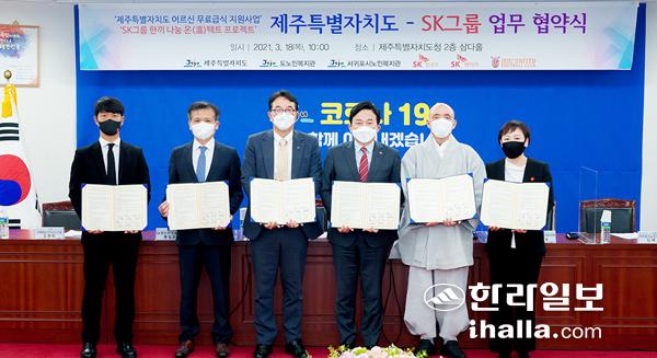 제주특별자치도는 18일 도청 삼다홀에서 SK그룹과 어르신 무료급식 지원사업 및 한끼 나눔 온(溫)택트 프로젝트 운영에 관한 업무협약을 체결했다.