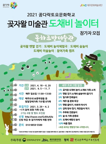 운영 기간은 1기와 2기를 합쳐 4월 18일부터 11월 7일까지로 일요일마다 프로그램이 개설된다. 제주 설화 속 '도채비 놀이'의 틀을 가져와 곶자왈 숲에서 도채비와 함께 마음껏 놀고, 도채비에게 가족의 소망을 기원하는 내용을 담고 있다. 총 20회차에 걸쳐 ▷곶자왈 맨발걷기 ▷도채비 체험놀이극 ▷트리클라이밍, 짚라인, 트리하우스, 대형 해먹 등 곶자왈 숲 놀이터 ▷도채비 미술놀이 등이 펼쳐진다. 이와 함께 가족 캠핑 프로그램, 제주 돌문화 특강 등이 예정됐다. 아동·청소년들에게 문화예술 체험 기회를 제공하고, 또래와 가족 간 소통할 수 있는 문화예술교육 프로그램이다.