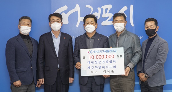대한전문건설협회 제주특별자치도회(회장 백상훈)는 지난 22일 시청 접견실에서 (재)서귀포시교육발전기금(이사장 현봉식)에 서귀포시교육발전기금 1000만원을 전달, 2011년을 시작으로 현재까지 총 1억8000만원을 기탁했다.