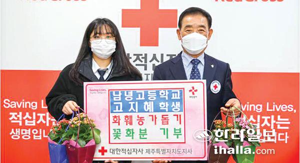남녕고등학교 2학년 고지혜 학생은 지난 19일 대한적십자사제주특별자치도지사(회장 오홍식)에 화훼농가를 돕고 코로나19 대응 의료진을 응원하기 위한 꽃화분 70개를 전달했다.