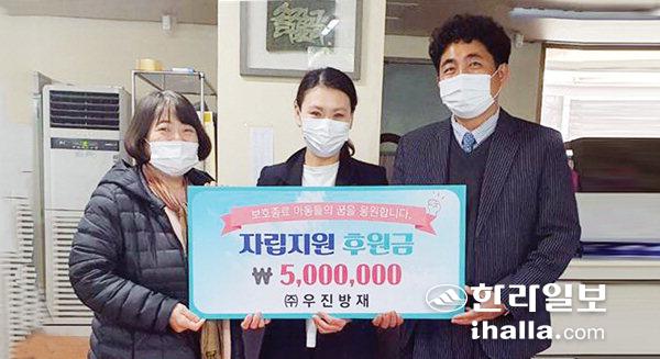 (주)우진방재(대표 변종옥)는 지난 18일 시온빌 자립생활관(관장 변성환)에 후원금 500만원을 전달했다. 후원금은 자립생활관에서 생활하고 있는 보호종료아동들을 위한 교육, 생활지원 및 기관 운영비로 사용될 예정이다.