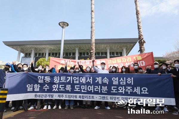 24일 제주 드람타워 복합리조트 직원들이 제주특별자치도의회 정문에서 드림타워 내 LT카지노 이전을 허가해 달라고 호소하고 있다. 이상국기자