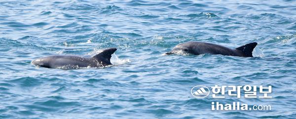 지난 2013년 7월 고향 제주바다로 돌아간 돌고래 '제돌이'가 24일 서귀포시 대정읍 해안도로 앞에서 남방큰돌고래와 함께 자유롭게 유영하는 모습이 카메라에 잡혔다. 등지느러미에 새겨진 1번 표식이 선명하다. 강희만기자