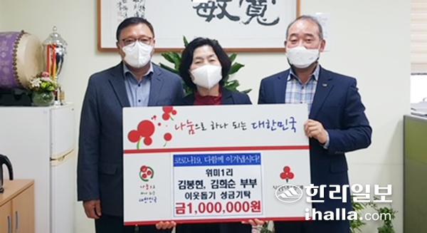 서귀포시 남원읍 위미1리에 거주하는 김봉현·김희순 부부는 최근 남원읍사무소(읍장 현종시)를 방문해 코로나19 장기화로 생활이 더 어려워진 취약계층을 위해 사용해 달라며 제주사회복지공동모금회(회장 김남식)에 이웃돕기 성금 100만원을 기탁했다.