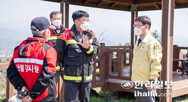 서귀포시는 지난 23일 봄철 산불 방지를 위해 군산오름과 탐라대학교 등 산불감시초소를 방문해 산불감시원 등 현장 근무자들을 격려했다. 또 산불 예방을 위한 시설 점검 및 입산객에게는 인화물질 휴대 금지 등의 홍보를 병행했다.