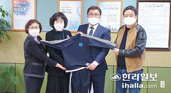 한천초등학교 총동문회(회장 한동철)는 지난 24일 교장실에서 1학년 신입생들에게 입학 선물로 한천초 교표가 새겨진 활동복을 기증했다. 한천초 총동문회는 2019학년도부터 올해까지 3년간 신입생들에게 활동복을 나눠주고 있다.