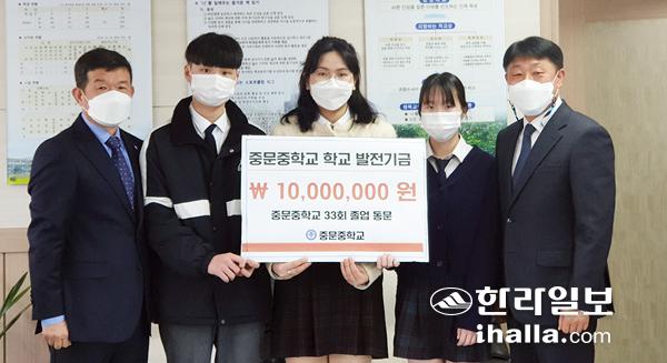 중문중학교(교장 고성원)는 지난 24일 중문중 제33회 졸업생인 익명의 선배가 학교발전기금 1000만원을 전달 했다고 밝혔다. 고성원 교장은 "따뜻한 학교, 행복한 교실이 되도록 학교 발전발전기금을 사용하겠다"라며 감사의 뜻을 전했다.