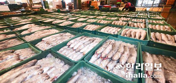 27일 제주시 한림수협어판장에서 어민들이 갓잡은 민어 선별및 포장 작업으로 분주한 시간을 보내고 있다. 이상국기자