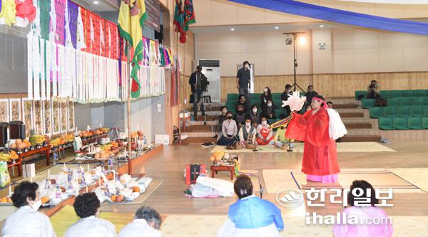 국가무형문화재이자 유네스코 인류무형문화유산인 제주칠머리당영등굿 송별제가 음력 2월 14일인 지난 26일 제주시 사라봉 자락에 있는 칠머리당영등굿전수관에서 열려 지역민들의 평안과 풍요를 기원하고 있다. 이상국기자