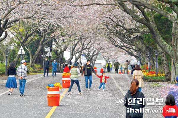 3월 마지막 휴일인 28일 제주시 애월읍 장전리를 찾은 도민과 관광객들이 벚꽃나무 아래서 봄을 만끽하고 있다. 강희만기자