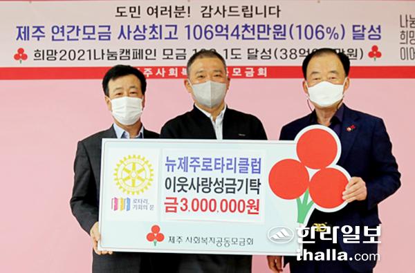 국제로타리 3662지구 뉴제주로타리클럽(회장 김성훈)은 지난 25일 제주사회복지공동모금회(회장 김남식)를 방문해 도내 어려운 이웃을 돕는 데 사용해 달라며 성금 300만원을 기탁했다.