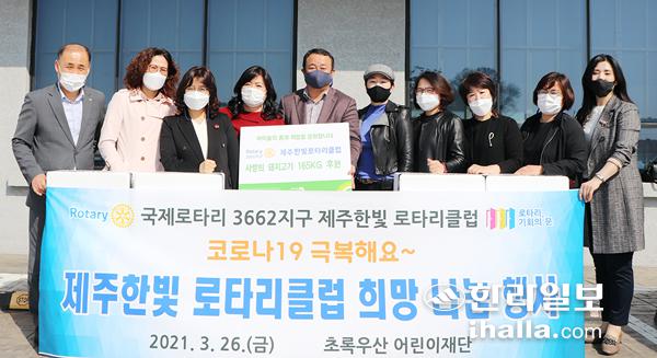 제주한빛로타리클럽(회장 양순애)은 지난 26일 성장기 아이들에게 건강한 음식을 제공하기 위해 초록우산 어린이재단 제주지역본부(본부장 김희석)에 사랑의 돼지고기 165㎏을 전달했다. 전달된 돼지고기는 도내 아동가정에 지원될 예정이다.