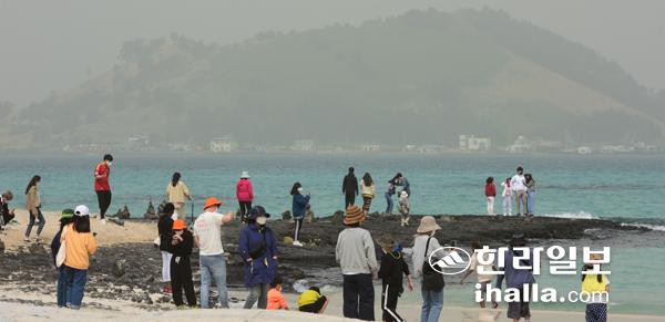 29일 짙은 황사에도 불구 많은 관광객들이 제주시 한림읍 협재해수욕장을 찾아 제주 바다를 즐기고 있다. 멀리로 비양도가 황사 속에서도 살포시 신비한 자태를 뽐내고 있다. 이상국기자