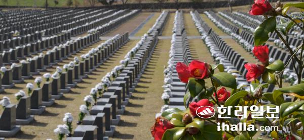 제주4·3 발발 73주년을 앞두고 30일 4·3평화공원 내 행불자 묘역에 심어져 있는 동백꽃이 원혼을 위무하듯 붉은 꽃망울을 터트렸다. 강희만기자
